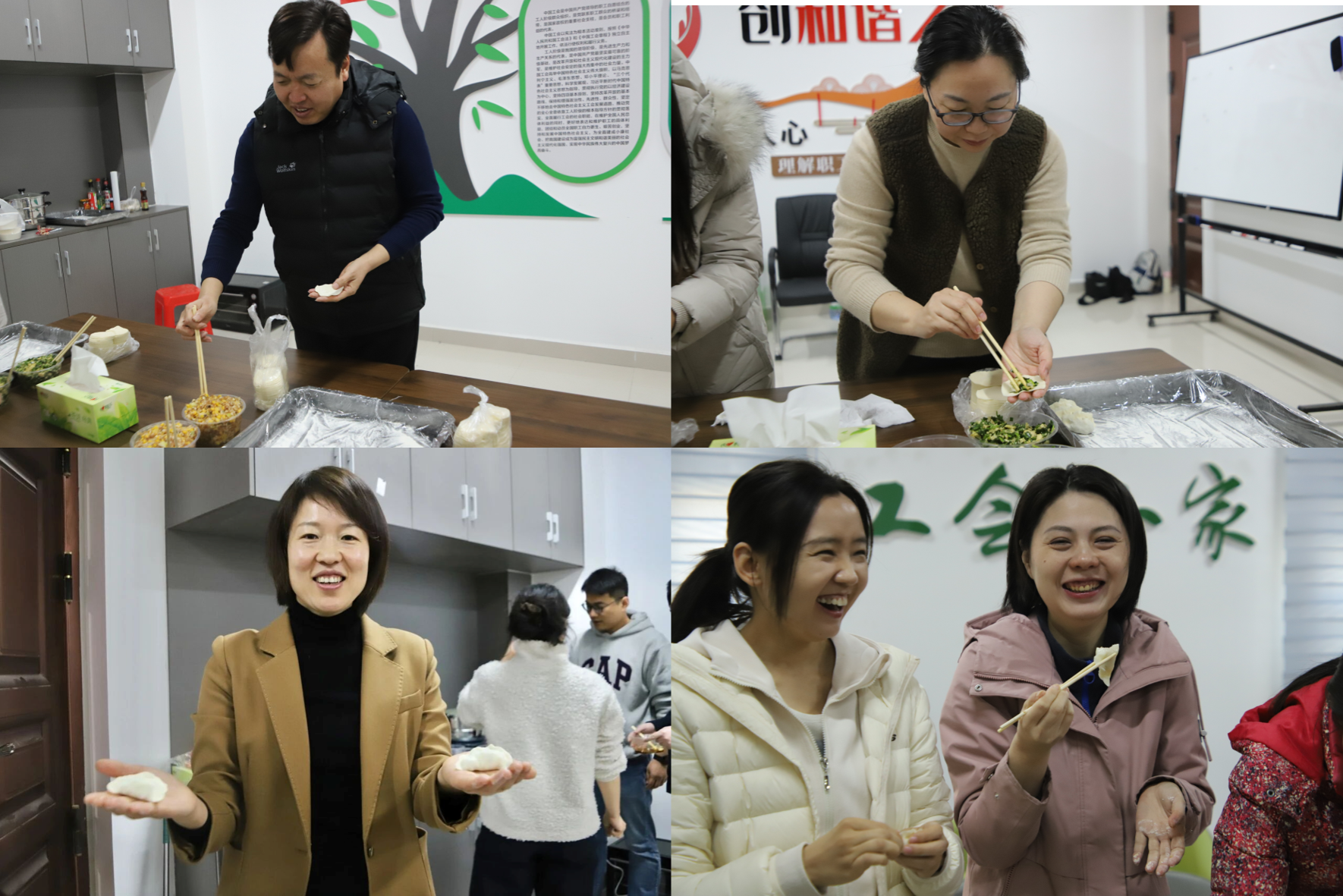 在工会小家大家围坐在一起,分工协作、配合有序。取皮、放馅、捏合成形,动作娴熟而专注。一枚枚饺子在指尖成形,逐渐整齐摆放在案板上,现场氛围轻松而热烈。负责煮饺子的老师,把一碗碗热气腾腾的饺子送到老师们面前,阵阵香气弥漫在活动现场。教职工们共同品尝亲手制作的饺子,在交流互动中分享劳动成果,感受线上麻将
